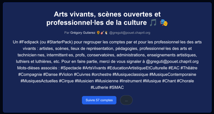Sur Mastodon, c'est la communauté des “FediDevs” (les développeurs informatiques qui utilisent Mastodon), qui est à l'initiative de ces #StarterPacks. Ils ont créé leur propre site pour rassembler toutes les initiatives en la matière. C'est sur ce site qu'on trouvera donc les #StarterPacks thématiques, dans plusieurs langues, y compris en français.