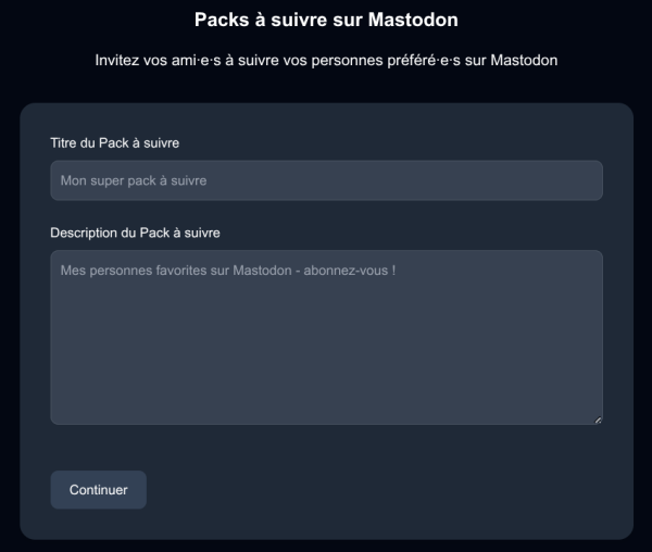 C'est très simple, rendez-vous sur https://fedidevs.com/starter-packs/create/ et vous pouvez tout de suite (après vous être identifié sur ce site) donner un titre à votre #StarterPack, rédiger une description de son contenu, et commencer à y inscrire des comptes.