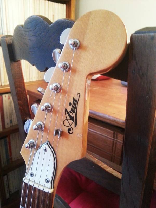 La 1802T d'Aria est une guitare vintage relativement rare, mais accessible pour un petit prix (j'ai acheté la mienne pour 205 €, frais de port compris, pour un exemplaire en parfait état cosmétique et électrique). Elle est produite à la fin des années 1960 par la société japonaise Aria, en guise de réponse aux célèbres stratocasters de chez Fender.