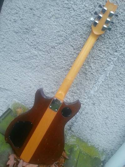 J'ai une photo de son état “d'origine” du moins son état quand je l'ai acheté (pour la modique somme de 70€), il s'agit de la photo dans l'herbe avec les deux humbuckers dorés. Le micro bridge était mort, ou du moins était très faiblard. Les photos avec les micros sans cover sont celle d'aujourd'hui avec ses micros Custom 77 splitables dont je n'arrive pas à me souvenir du nom.